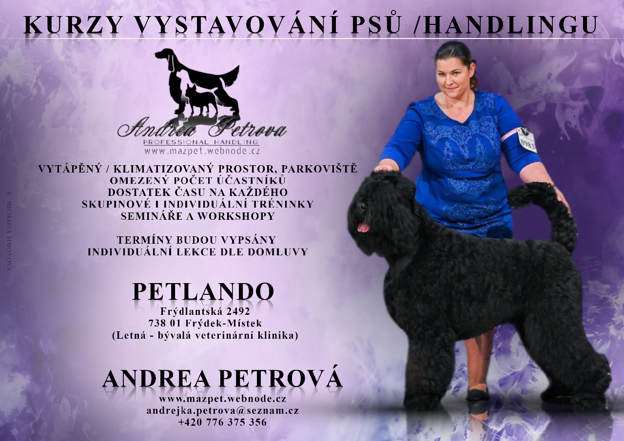 ZAČÁTEČNÍCI: Řekneme si úplné základy, ukážeme si, jak výstava probíhá a jak začít s předvedením psa. Jak mít správně vodítko, jak psa postavit a v postoji udržet, jak ukázat zuby, jak psa předvést v pohybu. Zároveň si zkusíme výstavu na nečisto. Vše tak, abyste věděli, co Vás na výstavě čeká a nemine.